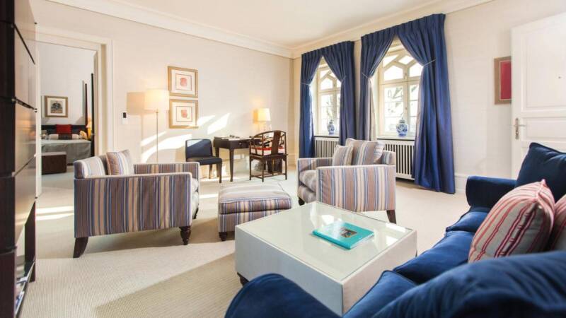Das Gebäude, ursprünglich unter dem Namen Palais Württemberg erbaut, ist ein fünfgeschossiger Baublock mit sechsachsigem, schwach hervortretendem Mittelrisalit. Im Giebel befindet sich eine Figurengruppe, die eine Frauengestalt auf Triumphwagen, von Hirschen und Löwen (den württembergischen Wappentieren) gezogen, darstellt. Im dritten und vierten Geschoss liegen im Mittelrisalit große Steinbalkone. Der Vorbau des Haupteinganges ist mit weißem Carrara Marmor verkleidet.
