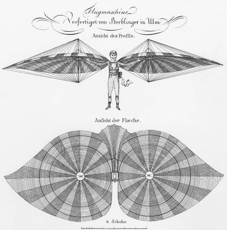 Fliegen zu können ist ein uralter Menschheitstraum. Bereits 1463 entwarf Leonardo da Vinci eine Tragschraube zum Abheben und analysierte den Vogelflug: Beim Aufwärtsschwung spreizen sie ihre Flügel, beim Abwärtsschlag legen sie sie an. Diese Prinzipien inspirierten auch Albrecht Berblinger in seiner Flugambition.